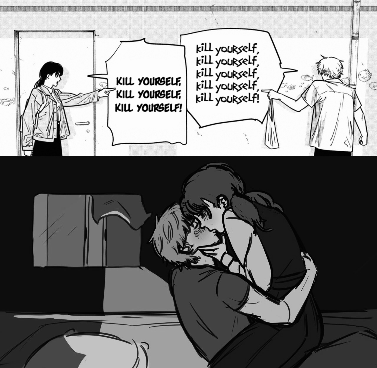 | … | 505無念Nameとしあき26/03/11(水)10:40:26No.1393079176+>(でもこれ腐ったパン未満の幸せなんだよな…)とか思いながら描いてたんかタツキ? |