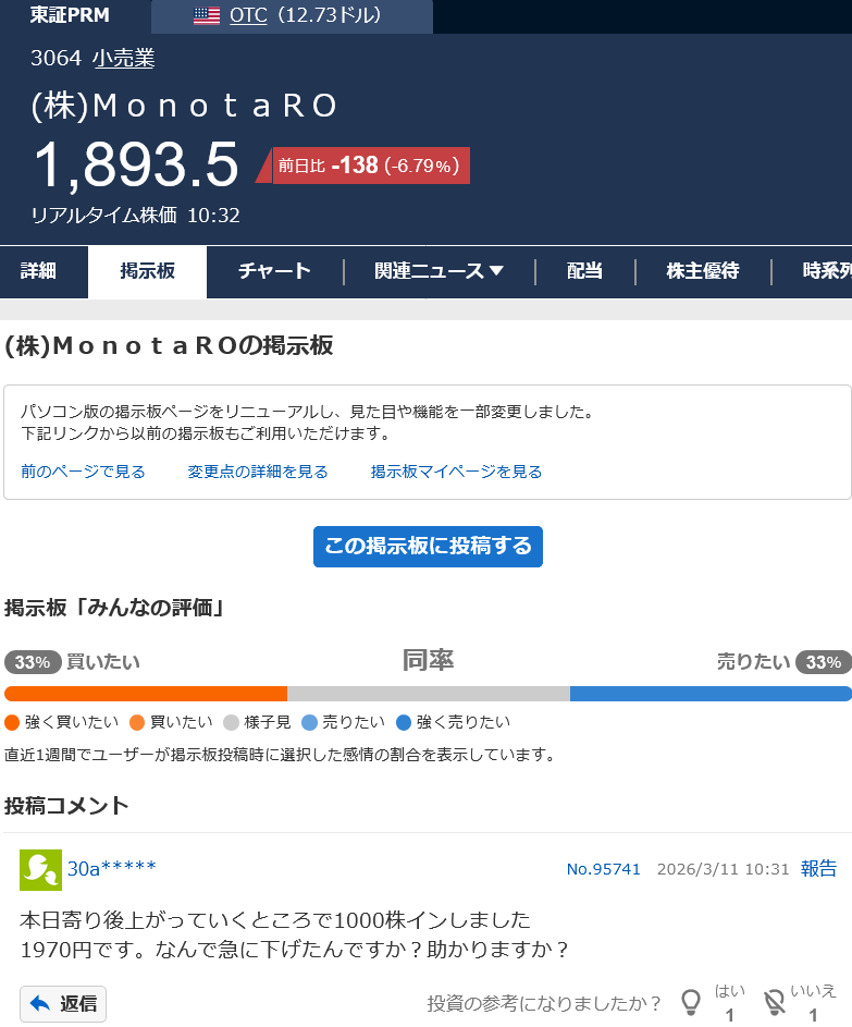 | … | 527無念Nameとしあき26/03/11(水)10:30:24 ID:agTZUPBYNo.1393077875+2日寝てたら元に戻った相場なので |