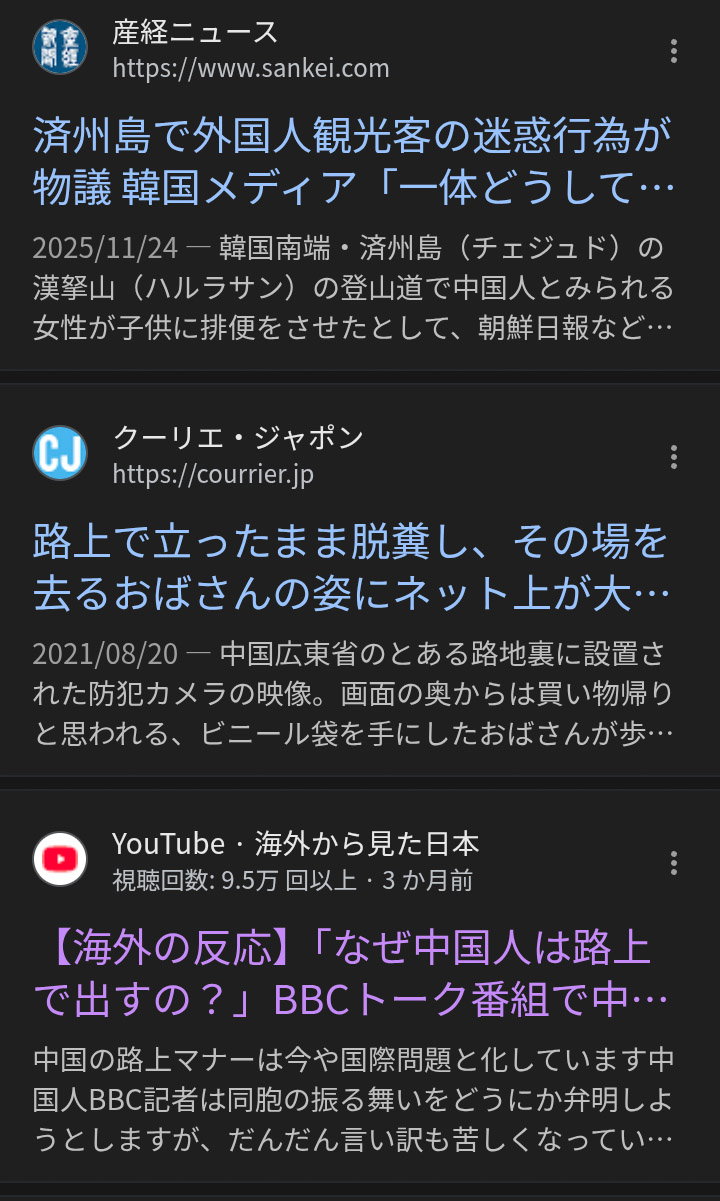 | … | 37無念Nameとしあき26/03/12(木)04:48:02No.1393268341+>世界中の路上でウンコする民族が他国民に好かれることがあるのだろうか? |