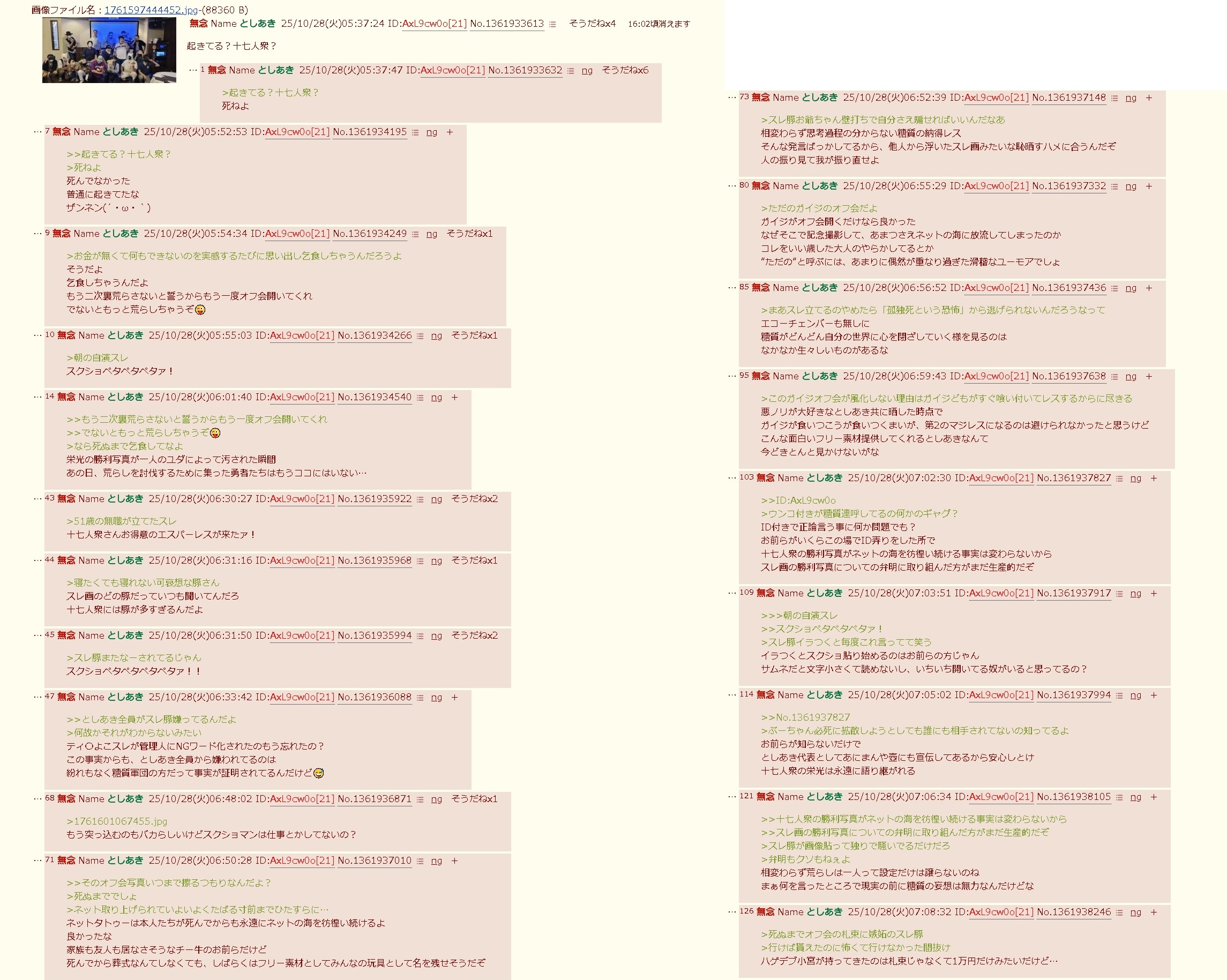 | … | 253無念Nameとしあき26/03/12(木)18:12:34 ID:kQQXre/sNo.1393369644+>>皆オフ会写真を見てハゲデブだらけだなって笑ってるだけなのに |