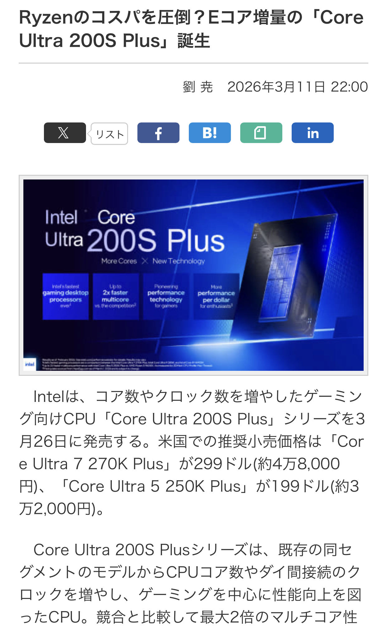 | … | 1無念Nameとしあき26/03/13(金)00:35:36No.1393459224+Core Ultra 200S Plusシリーズは、既存の同セグメントのモデルからCPUコア数やダイ間接続のクロックを増やし、ゲーミングを中心に性能向上を図ったCPU。競合と比較して最大2倍のマルチコア性能を実現し、コストパフォーマンスを向上させた。 |