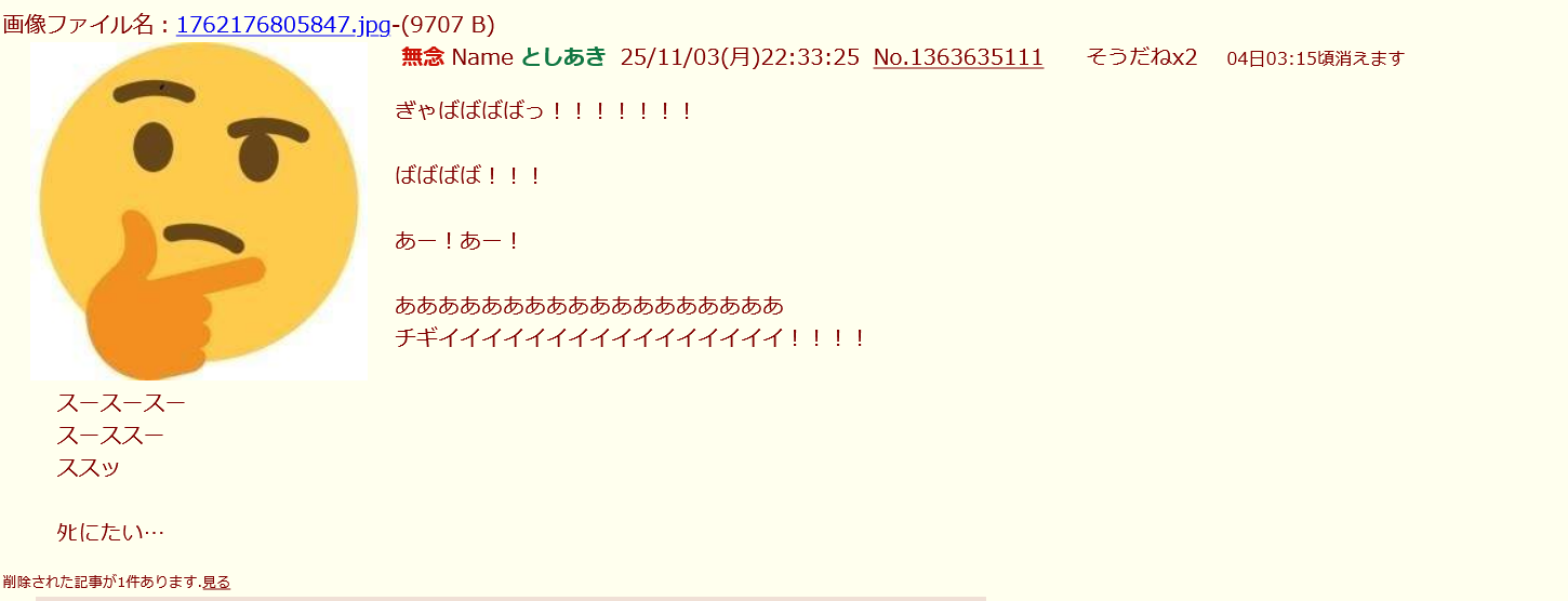 | … | 4無念Nameとしあき26/03/13(金)11:51:55 ID:j7RYoSfgNo.1393511598+削除依頼によって隔離されました |