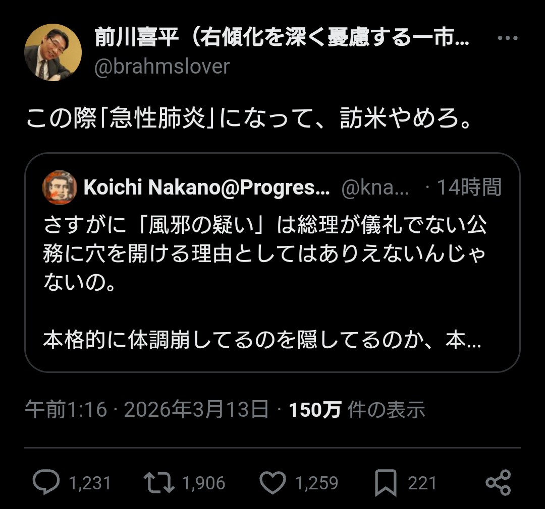 | … | 19無念Nameとしあき26/03/13(金)13:48:19No.1393531586そうだねx14なんかヤクでも決めてるパヨちんがおるな |