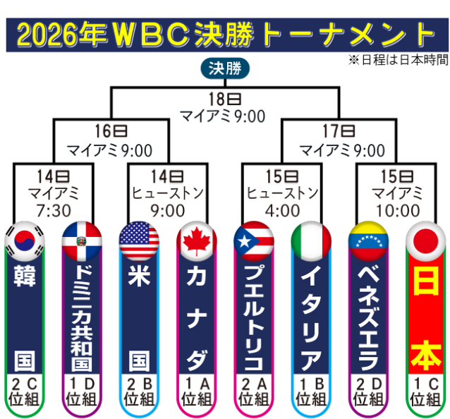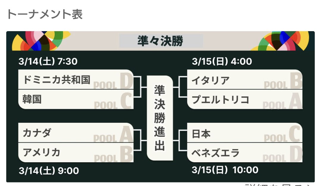 | … | 53無念Nameとしあき26/03/14(土)09:35:05 ID:ArF7gBJoNo.1393703025+>このトーナメント表、日本が勝った場合の準決勝の相手が必ずしもプエルトリコかイタリアって表じゃないんだよな……… |