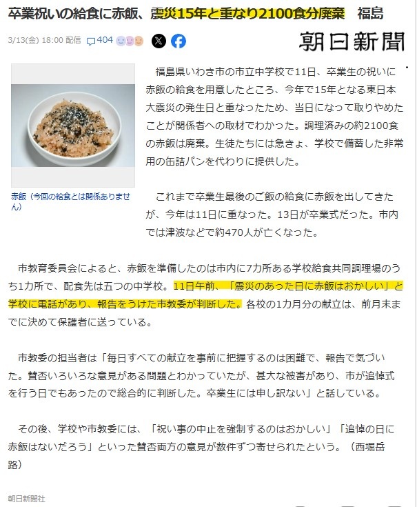 3月11日に卒業祝いの赤飯が給食に出てしまったので廃棄する中学校