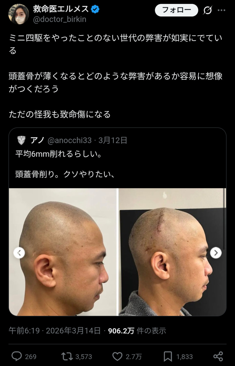 | … | 45無念Nameとしあき26/03/14(土)22:52:30No.1393876043+頭蓋骨83パー持ってかれてるって脳は運良くダメージ無かったんだろうか |