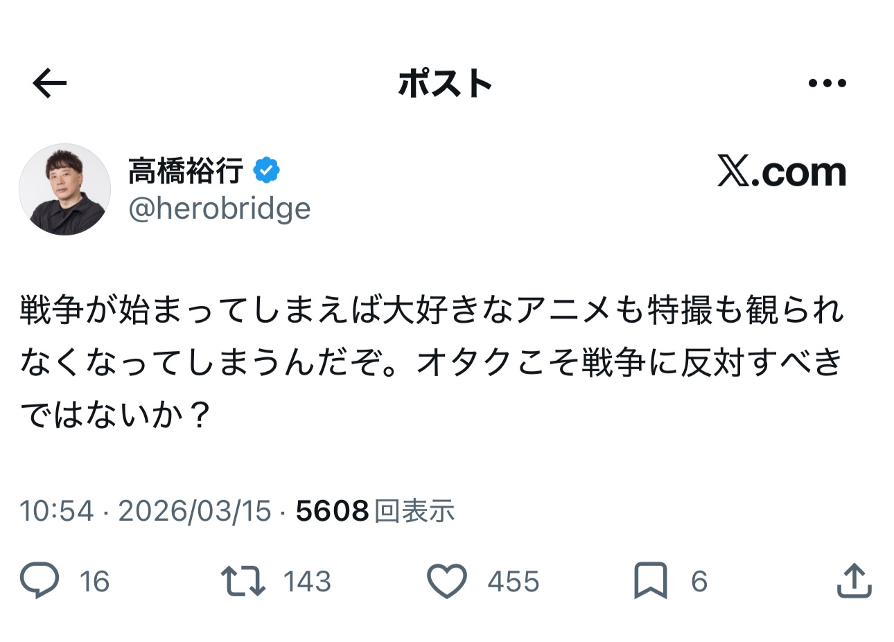 | … | 271無念Nameとしあき26/03/15(日)19:14:09No.1394095129+元から軍靴の音が聞こえてくるとか頭おかしいことしか言ってないのに |
