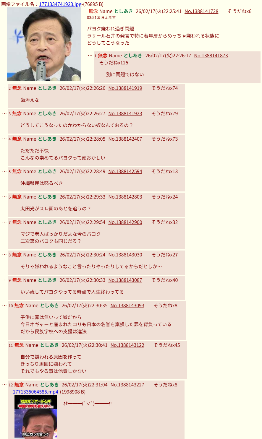| … | 265無念Nameとしあき26/03/15(日)19:12:09No.1394094582+年寄りパヨクで会うバイトでもないやつは |