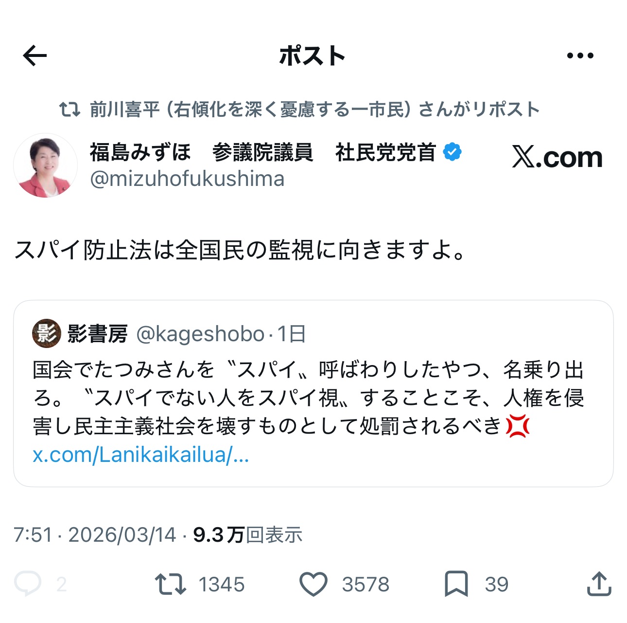 | … | 274無念Nameとしあき26/03/15(日)19:14:52No.1394095331+>こういうの撒き散らすからパヨク嫌われるんだよね |
