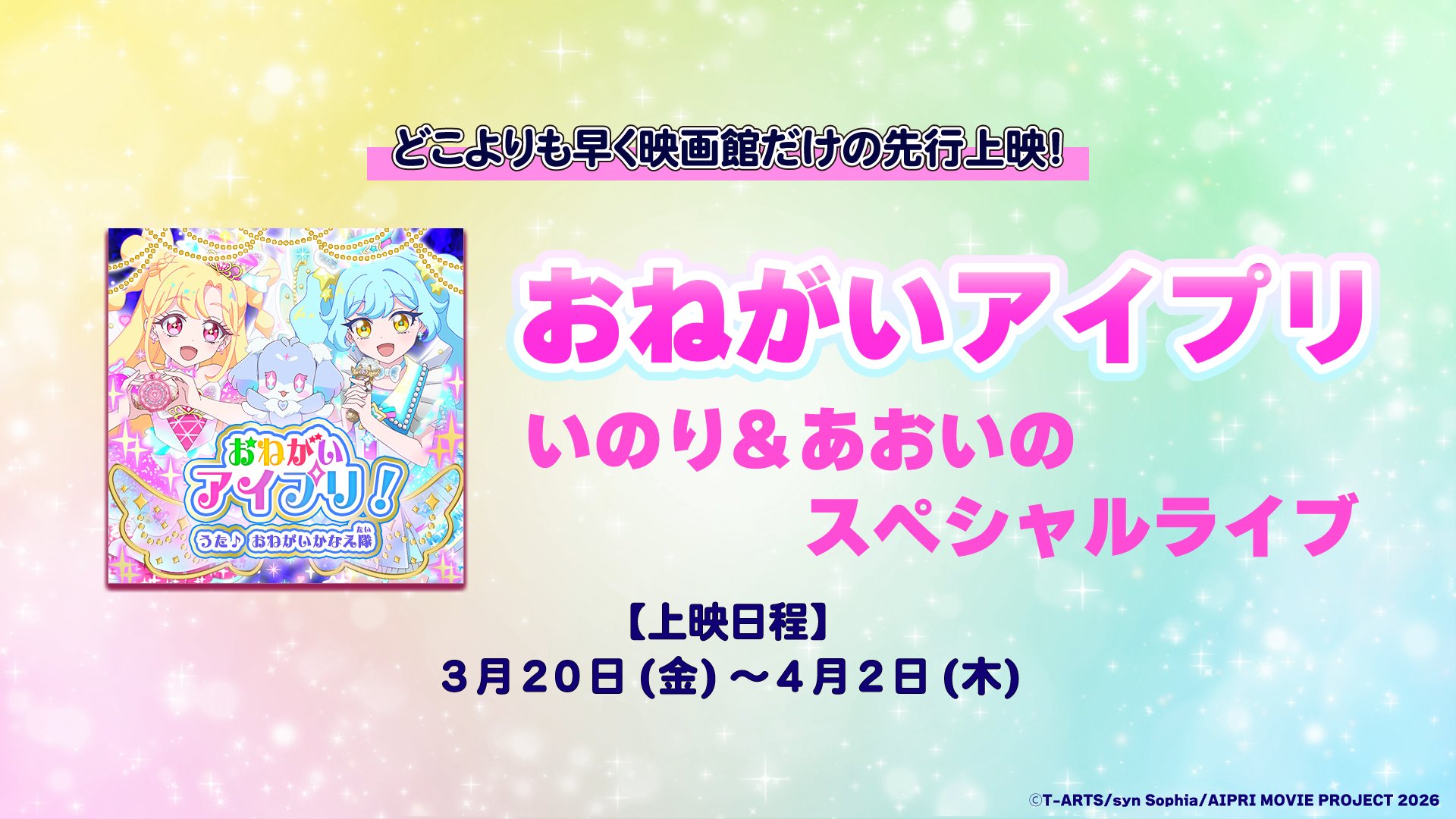 | … | 6無念Nameとしあき26/03/16(月)19:22:44 IP:58.3.*(ipv4)No.1394309996+ 1773656564204.jpg-(271443 B) 映画大ヒット記念!『映画ひみつのアイプリ まんかいバズリウムライブ!』本編終了後に『おねがいアイプリ』のいのり&あおいのスペシャルライブ映像を上映! |