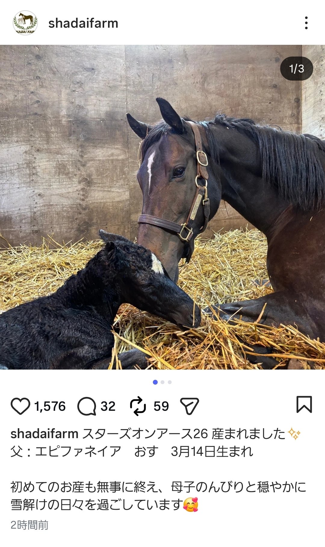 | … | 27無念Nameとしあき26/03/17(火)10:53:28No.1394433486そうだねx7 1773712408046.jpg-(1124555 B) 大喜びで駆けまわるかわいい仔は、生まれたばかりのエフフォーリア産駒。 |