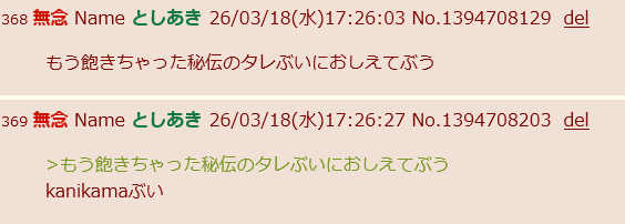| … | 2無念Nameとしあき26/03/18(水)23:48:22No.1394800646+今日のカニカマをお知らせするので? |