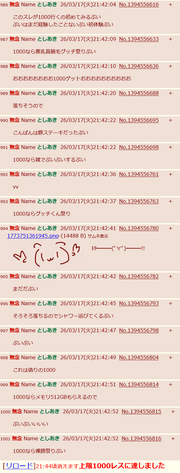 | … | 237無念Nameとしあき26/03/19(木)01:07:57No.1394814671+リクスレが立たないからここで1000の愚痴自演始めちゃったぶう |