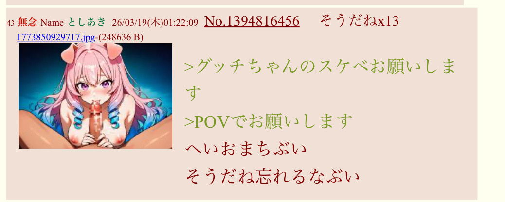 | … | 62無念Nameとしあき26/03/19(木)00:16:11No.1394806373+リクスレでグッチちゃんのスケベお願いしますって自演したら怒られるぶい? |