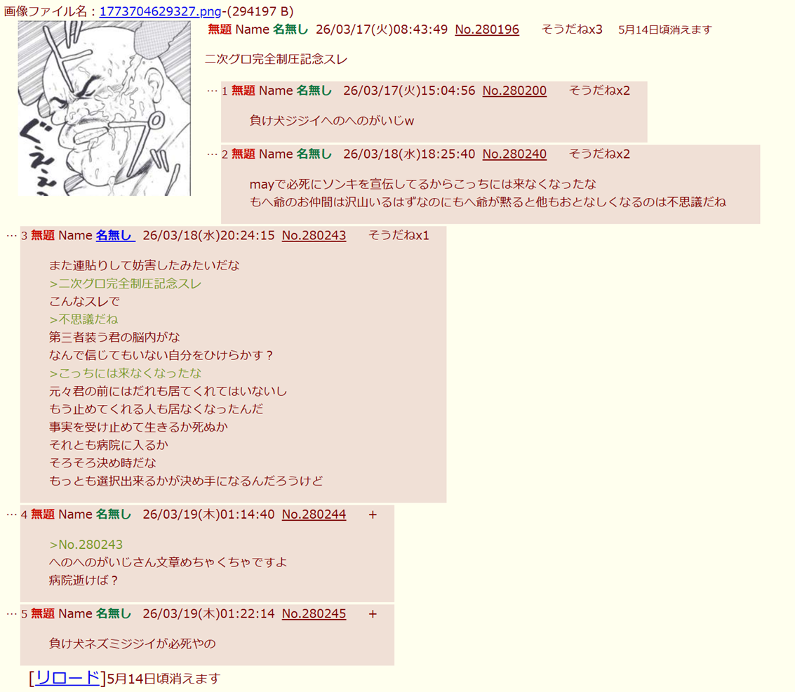 | … | 59無念Nameとしあき26/03/19(木)01:20:16No.1394816227+>へのへのがいじさんまだソンキ粘着してるの?きっしょ |