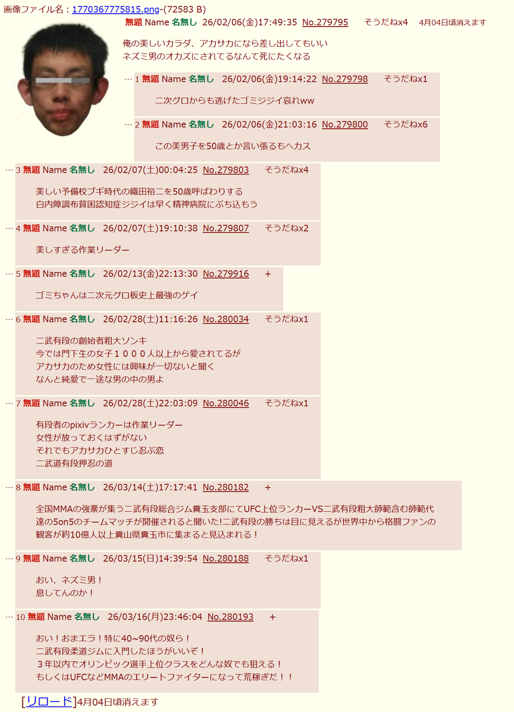| … | 63無念Nameとしあき26/03/19(木)01:22:36No.1394816510+>へのへのがいじさんまだソンキ粘着してるの?きっしょ |