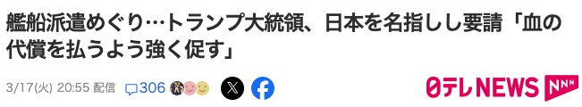 | … | 98無念Nameとしあき26/03/19(木)01:15:25No.1394815646+日本やオーストラリア方面が乗り気じゃないのはまあいいやで非協力なNATOにメチャ怒ってるてニュースでやってた |