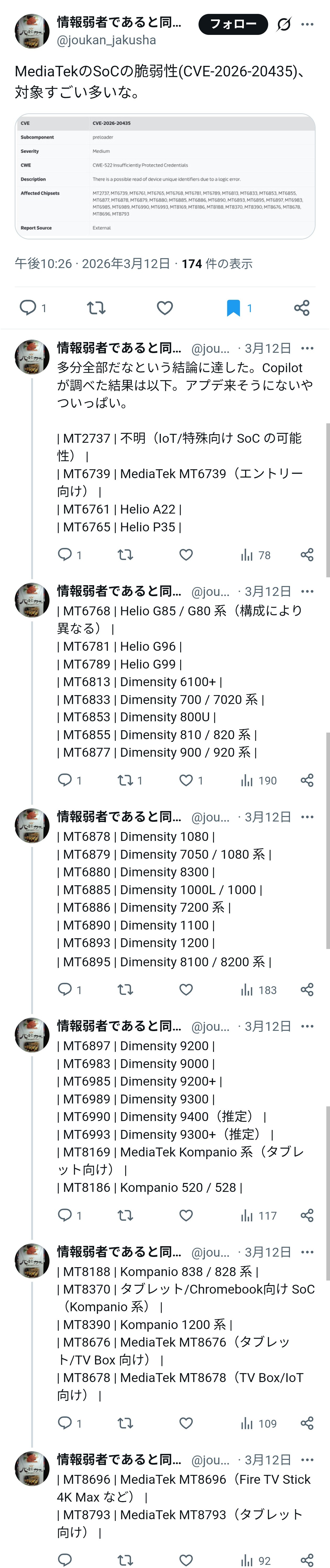 | … | 71無念Nameとしあき26/03/19(木)13:23:21No.1394882028+MediaTekの7000番代の問題だからほぼほぼ関係ないんじゃね? |