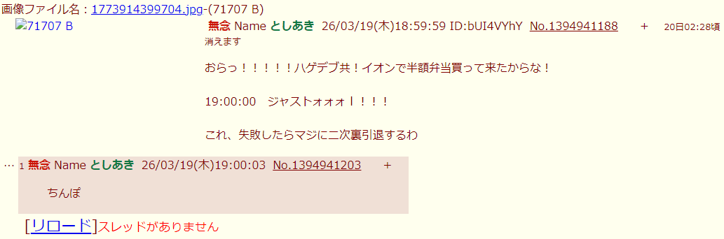 | … | 7無念Nameとしあき26/03/19(木)19:01:01No.1394941450そうだねx14>12:00:00ジャストォォォ!!!! |