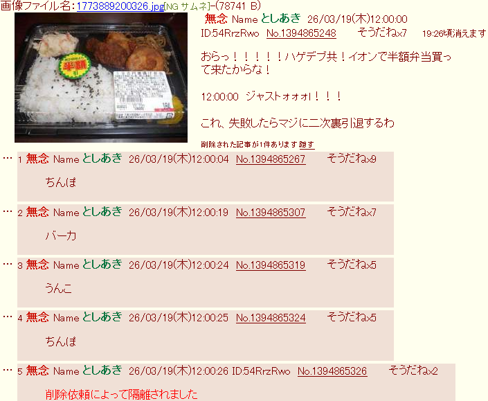 おらっ!!!!!ハゲデブ共!イオンで半額弁当買って来たからな!削除された記事が1件あります.見る