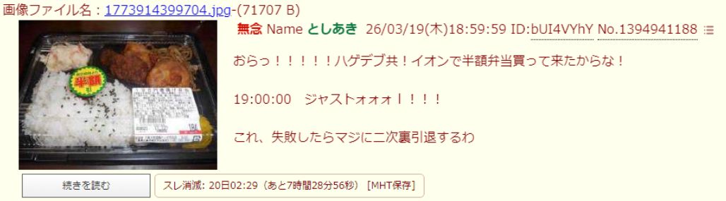 | … | 30無念Nameとしあき26/03/19(木)19:05:46No.1394942500そうだねx9買ってもいない弁当の画像貼るって段階で意味わかんねえからな |