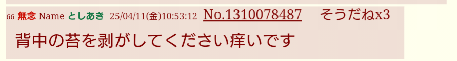 | … | 71無念Nameとしあき26/03/19(木)19:40:53No.1394950674+>>背中に苔は生えてるけどな |