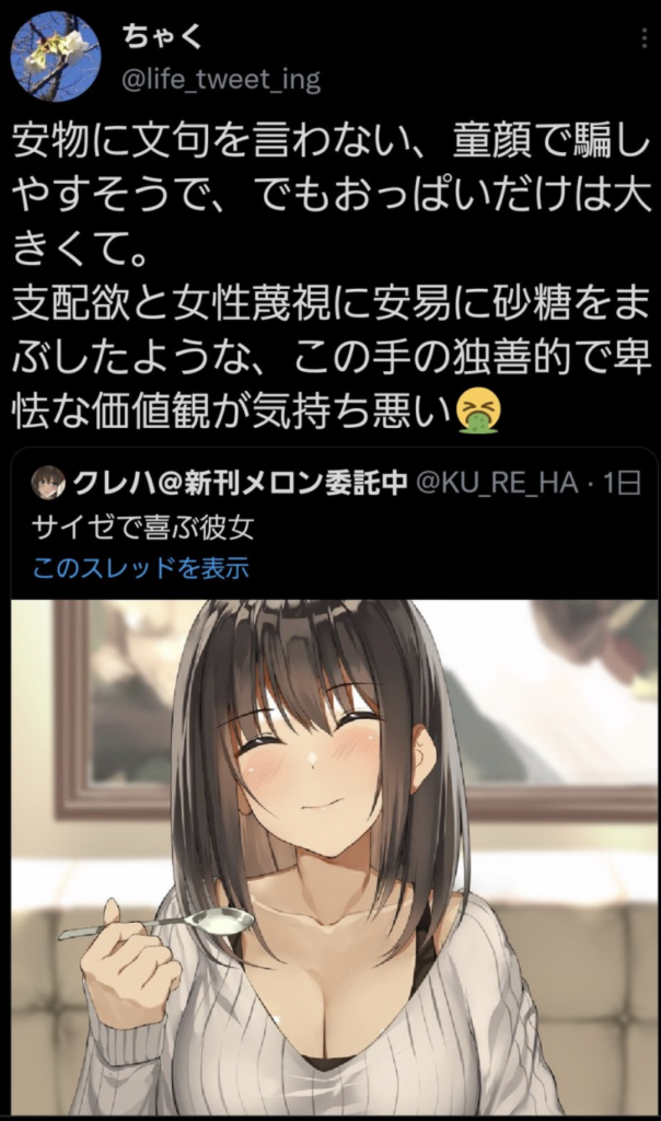 | … | 93無念Nameとしあき26/03/20(金)06:20:59No.1395046378+2021年以降表現規制スレに変化が起こりこれまでの萌え叩きエロ叩きに加えて腐女子BL叩きが始まった |