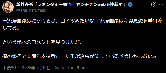 | … | 228無念Nameとしあき26/03/20(金)09:29:16No.1395065091そうだねx1>手塚御大は発表する媒体を選ばなかっただけのことで共産シンパではないね |