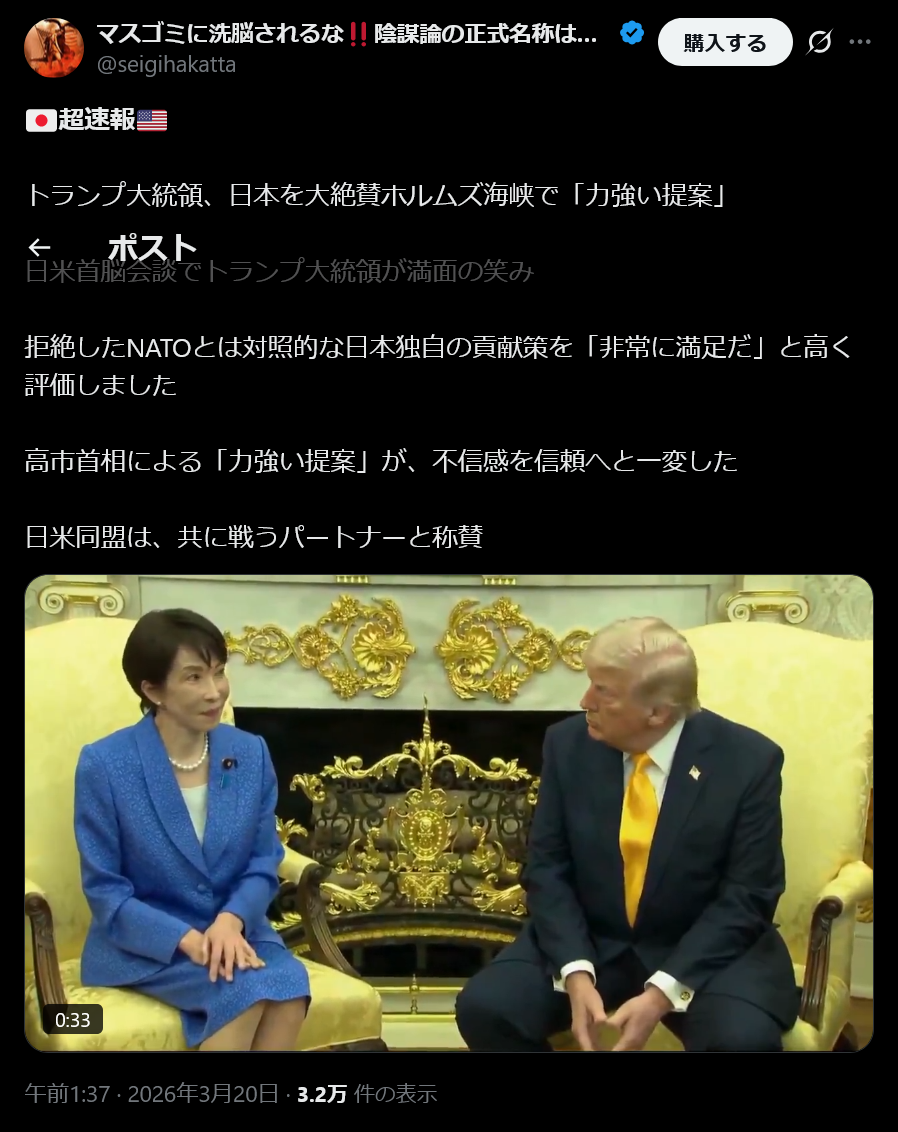 | … | 22無念Nameとしあき26/03/20(金)03:30:36No.1395040700+これで高市信者=トランプ信者って事になったけど高市信者はその辺どう思ってるのか聞きたいわ |