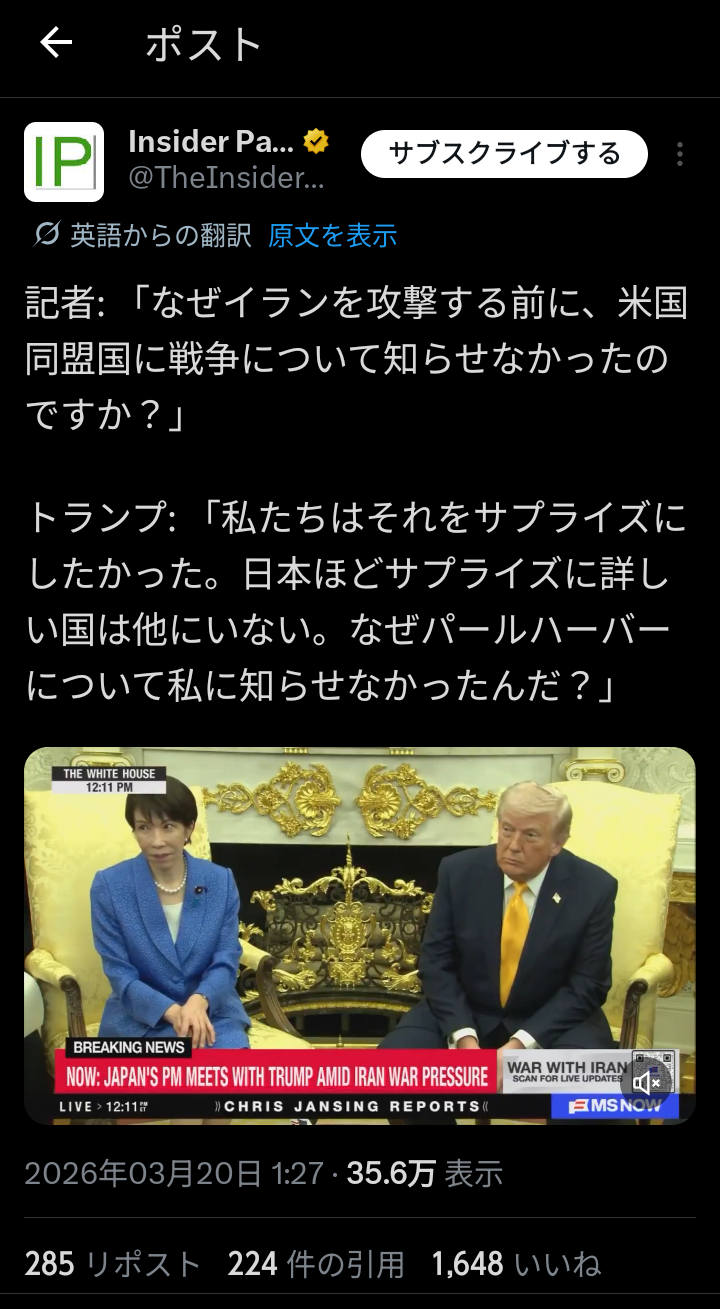| … | 32無念Nameとしあき26/03/20(金)05:06:03No.1395043844+1941年の真珠湾攻撃についても言及し、「奇襲について日本ほどよく知っている国があるだろうか。なぜ真珠湾攻撃のことを教えてくれなかったのか」と高市氏に語った。 |