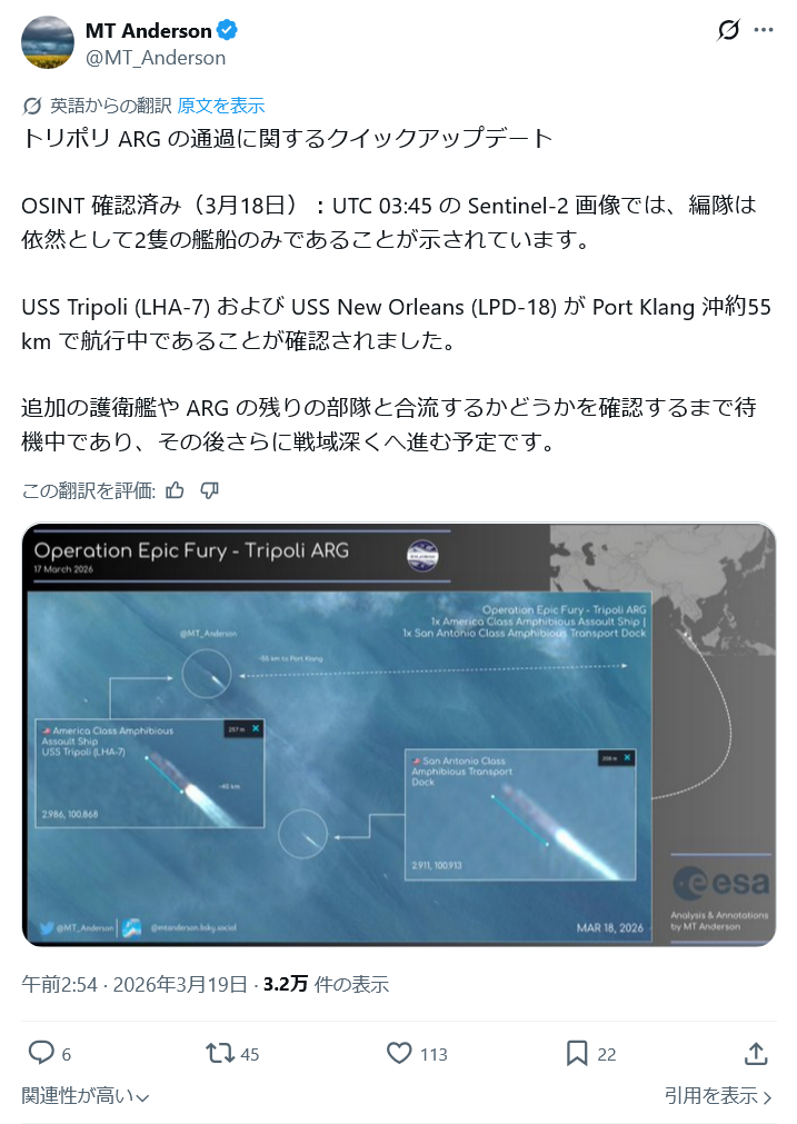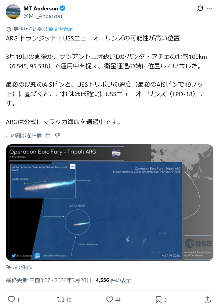 | … | 1無念Nameとしあき26/03/20(金)04:07:30No.1395041933そうだねx1 1773947250839.png-(355747 B) 19日にはUSSニューオーリンズ(LPD-18)の位置がほぼ特定されました |