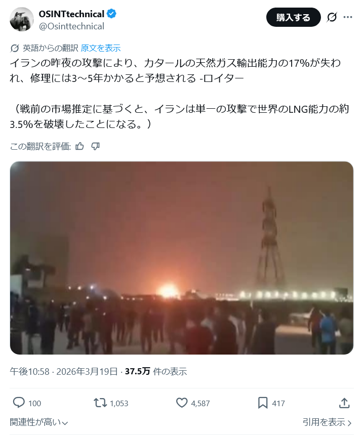 | … | 10無念Nameとしあき26/03/20(金)04:19:37No.1395042361そうだねx1 1773947977393.png-(242322 B) 先日のイランのカタール石油関連施設への報復攻撃で輸出能力の17%が失われ完全復旧には3〜5年間かかるとの見通し |