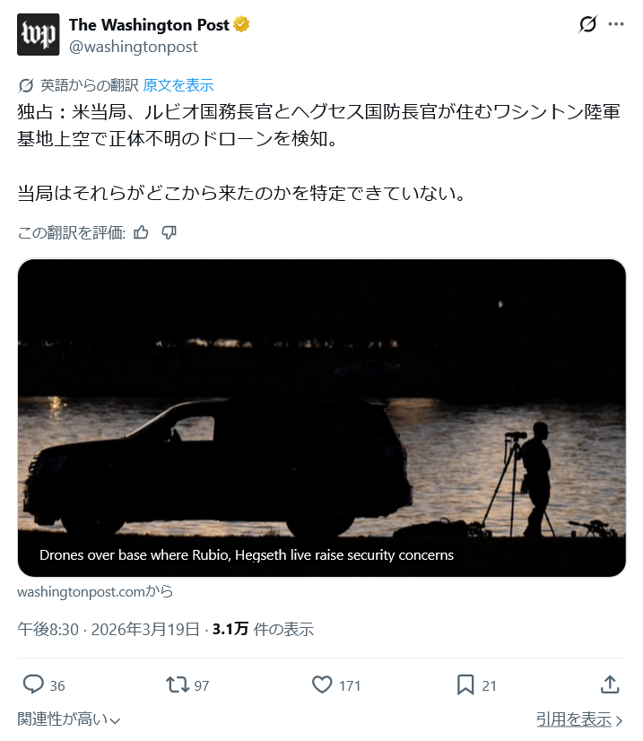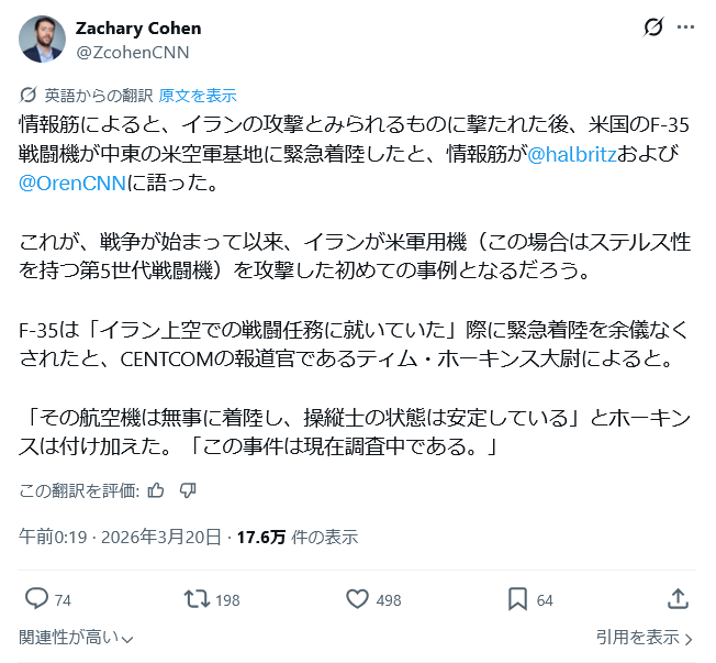 | … | 37無念Nameとしあき26/03/20(金)05:17:15No.1395044179+>その原因がイランの攻撃なのか故障なのかは公式発表としてはまだないって様子 |