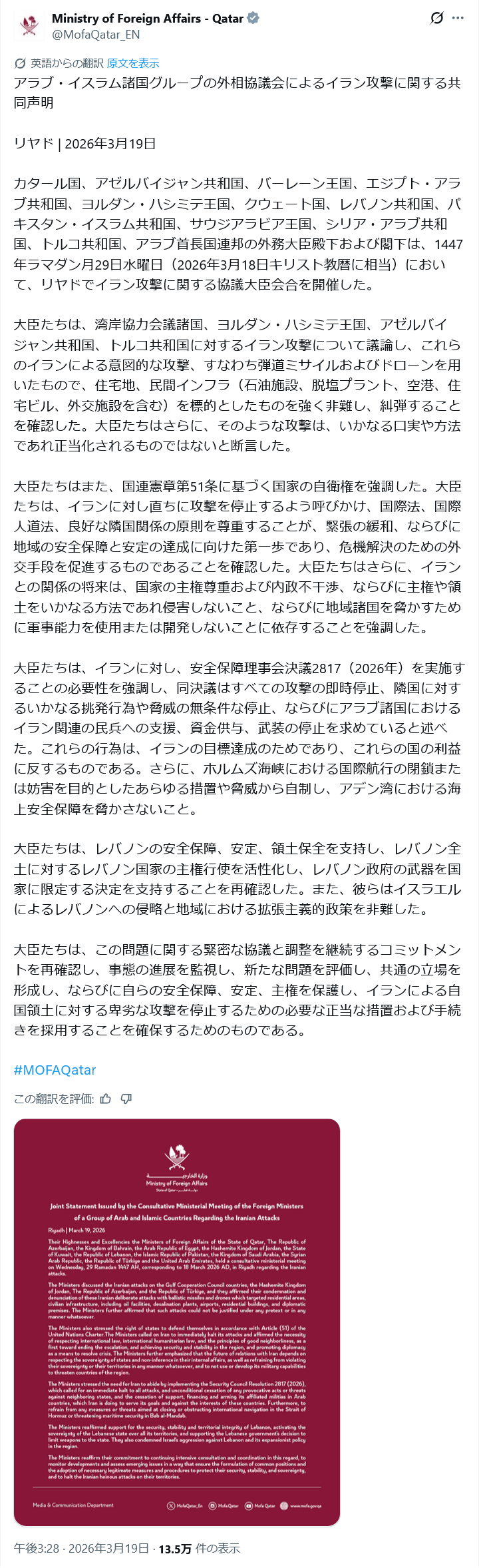 | … | 28無念Nameとしあき26/03/20(金)05:02:00No.1395043711そうだねx3 1773950520267.png-(604135 B) カタール国、アゼルバイジャン共和国、バーレーン王国、エジプト・アラブ共和国、ヨルダン・ハシミテ王国、クウェート国、レバノン共和国、パキスタン・イスラム共和国、サウジアラビア王国、シリア・アラブ共和国、トルコ共和国、アラブ首長国連邦がリヤドでイラン攻撃に関する協議大臣会合を開催 |