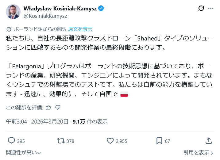 | … | 32無念Nameとしあき26/03/20(金)05:10:03No.1395043962+ 1773951003032.png-(65027 B) ポーランドのある会社がシャヘドタイプの攻撃型ドローンを開発中と表明 |