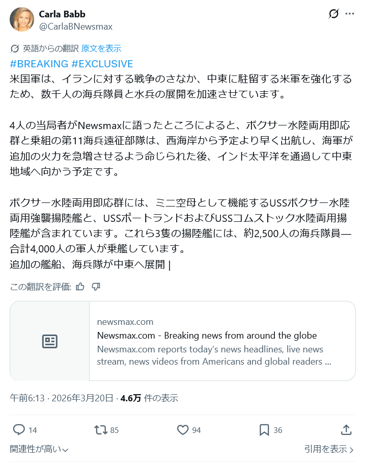 | … | 75無念Nameとしあき26/03/20(金)07:23:37No.1395050580+>佐世保のMEUの他に西海岸からボクサー水陸両用即応群と第11海兵遠征部隊の増派を予定 |