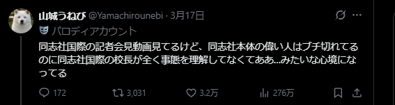 | … | 71無念Nameとしあき26/03/20(金)07:19:15No.1395050200そうだねx1>重大な事件を流行りネタ程度の感覚でいっちょ噛みしてるだけのような… |