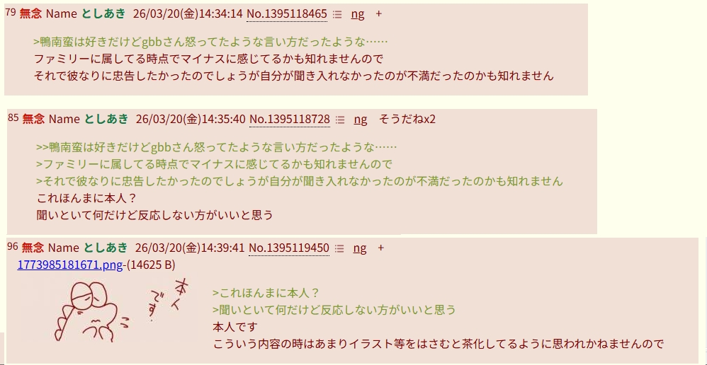 | … | 100無念Nameとしあき26/03/20(金)15:20:21No.1395127023+絵描雑談スレをコピペで荒らすのやめてください! |
