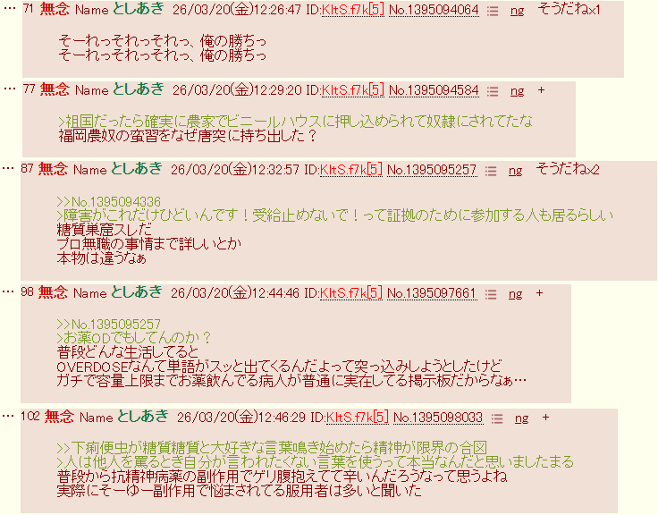 | … | 144無念Nameとしあき26/03/20(金)14:12:29No.1395114587+>必死こいて恥を上塗りするあたりやっぱ統合失調症のやつがネットやっても当人が不幸になるだけだねという証明になってる |