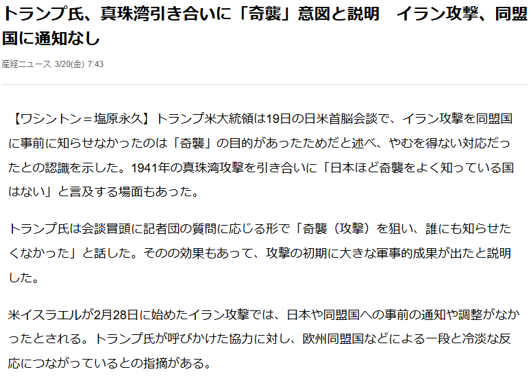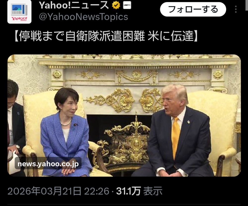 | … | 366無念Nameとしあき26/03/22(日)01:08:10No.1395501602+>日米首脳会談前はそういう意見にいいねつきまくってやばかったぞここ |
