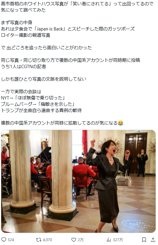 | … | 421無念Nameとしあき26/03/22(日)01:26:36No.1395504198そうだねx3>いやホワイトハウス公式が「躍り狂う高市早苗」をトップに持ってきてるんだが |