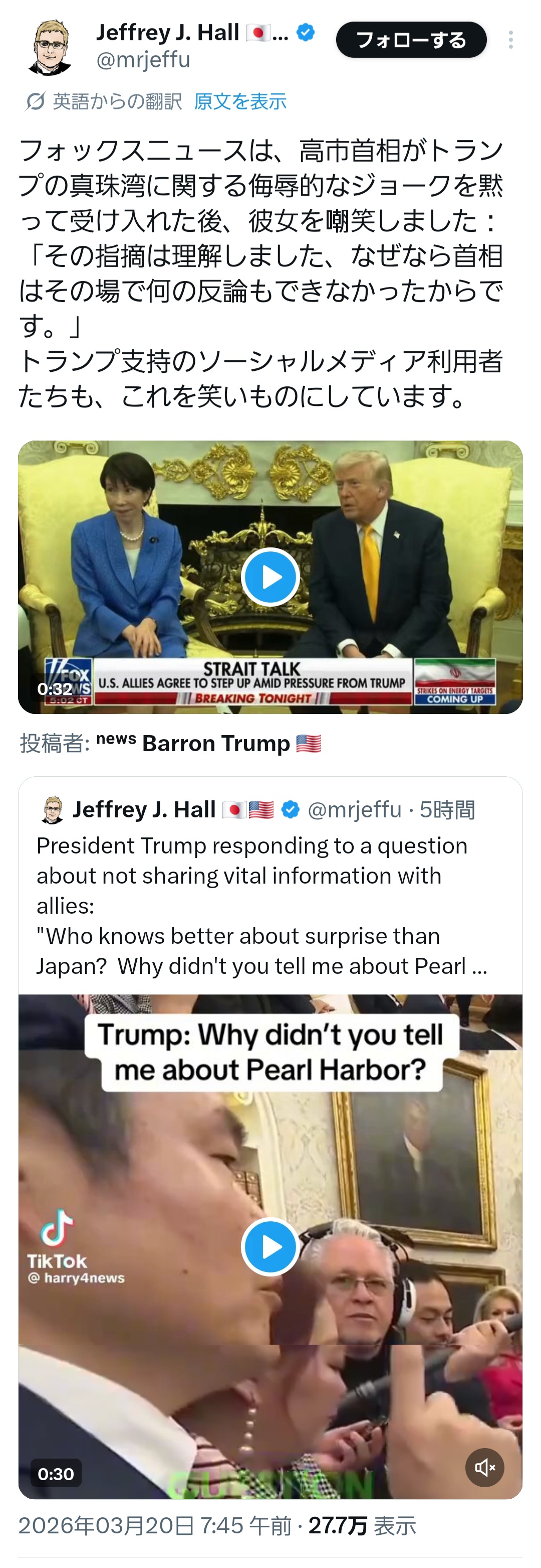 | … | 72無念Nameとしあき26/03/22(日)00:16:17No.1395492085そうだねx8日本の総理は我々の機嫌を取るためなら何でもするってホワイトハウスから世界に向けた宣伝 |