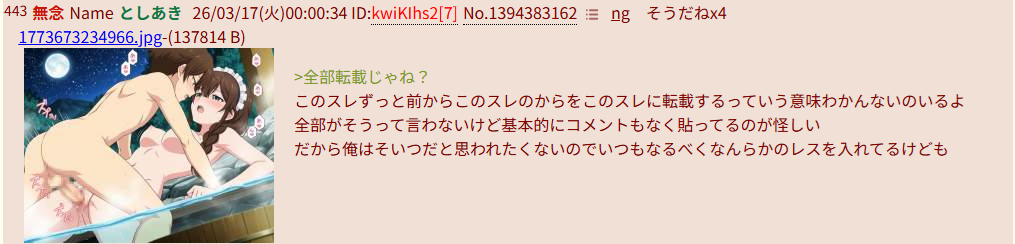 | … | 328無念Nameとしあき26/03/22(日)14:36:33No.1395603920+エロスレのテンプレには転載ダメなん記載あったぶい? |