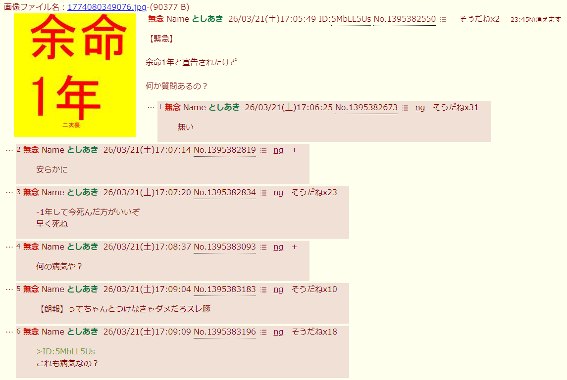 | … | 32無念Nameとしあき26/03/22(日)22:45:45No.1395728910そうだねx1>統合失調症バレしたソンキくんが立てたスレ |
