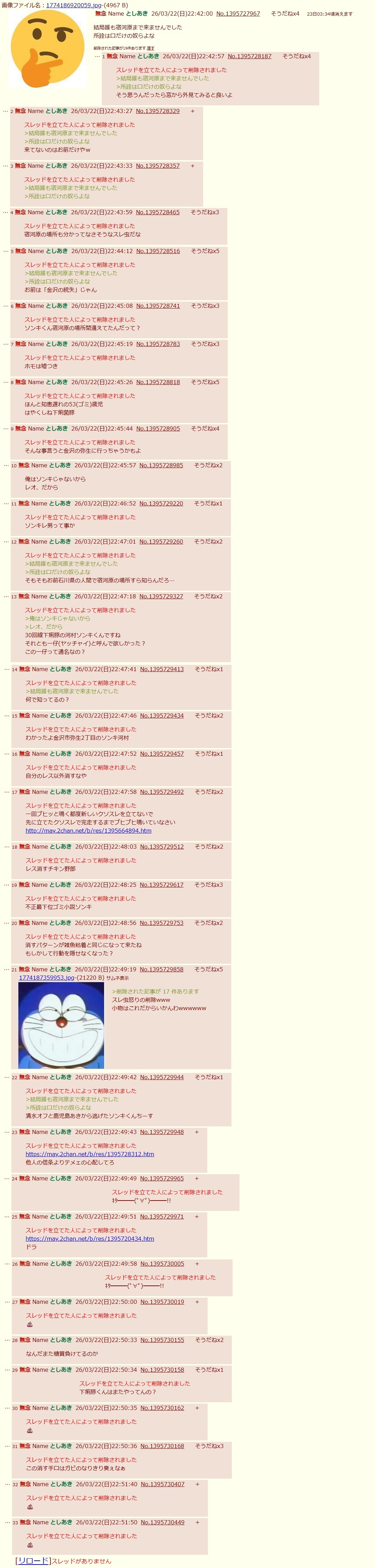 | … | 37無念Nameとしあき26/03/22(日)22:56:23No.1395731586+ただの殺害予告性犯罪者河村ヤッチャイのクソスレ |