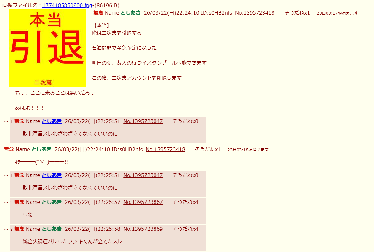 | … | 15無念Nameとしあき26/03/22(日)22:32:39No.1395725695そうだねx2 1774186359002.jpg-(49152 B) >二次裏アカウント |