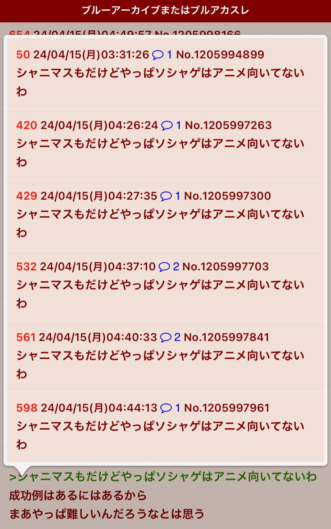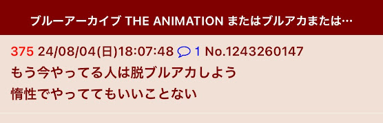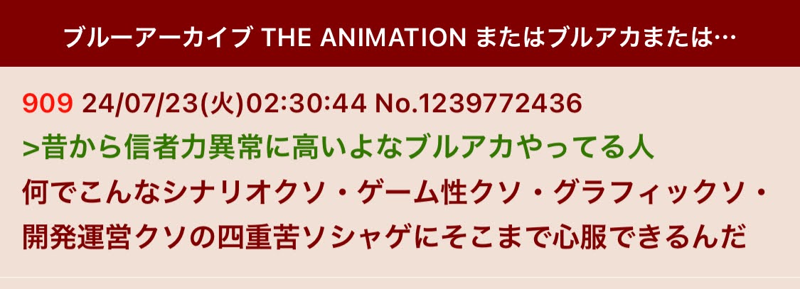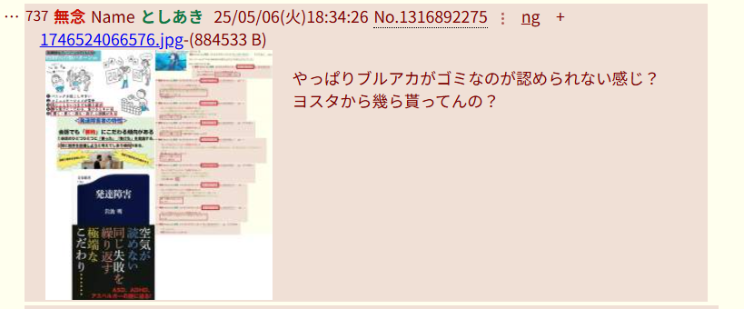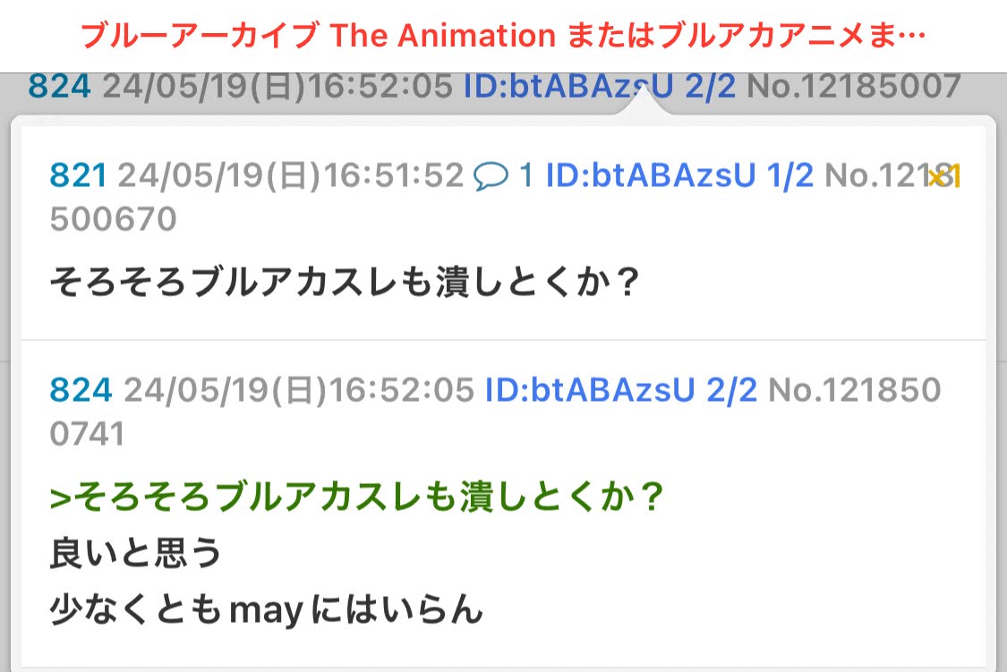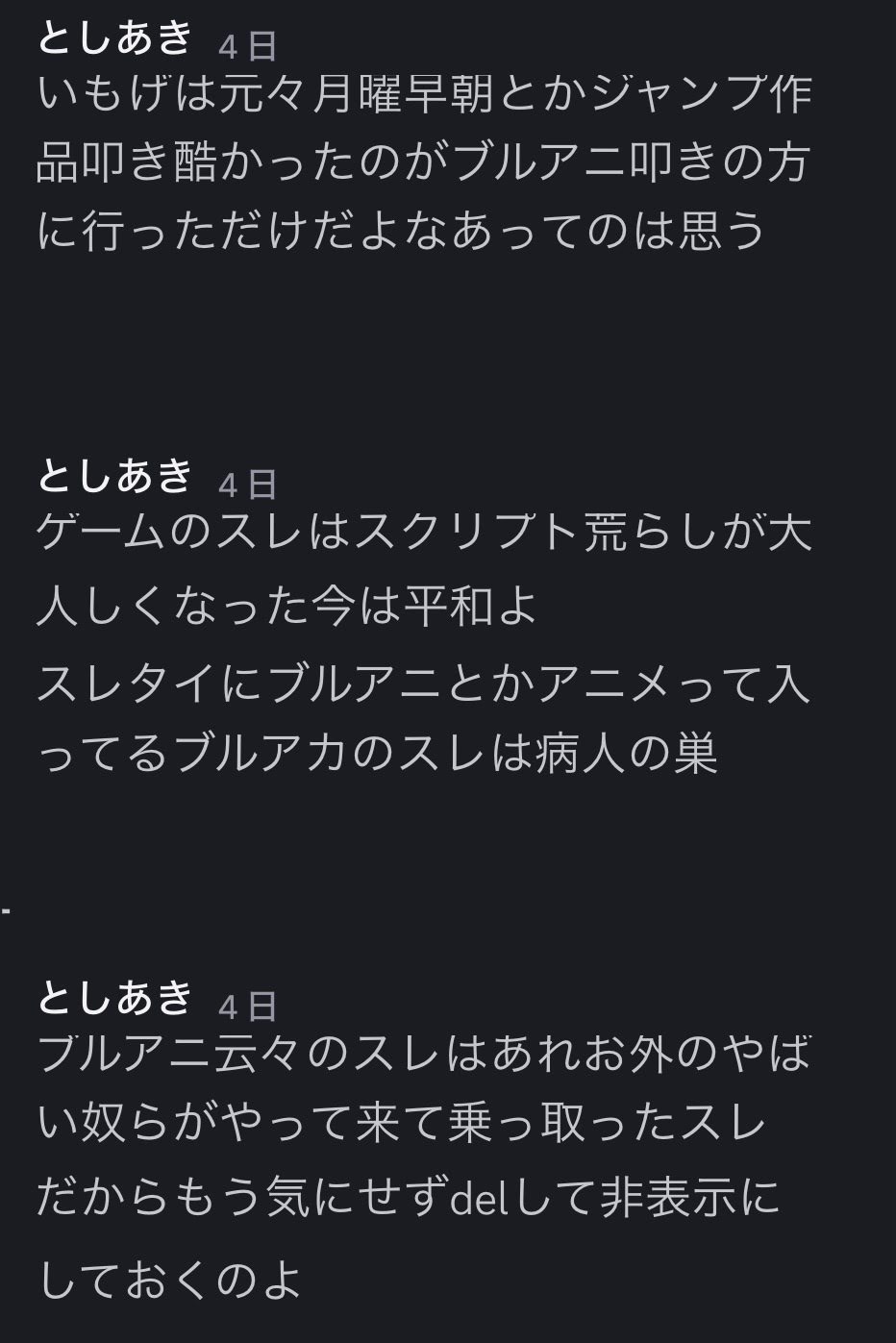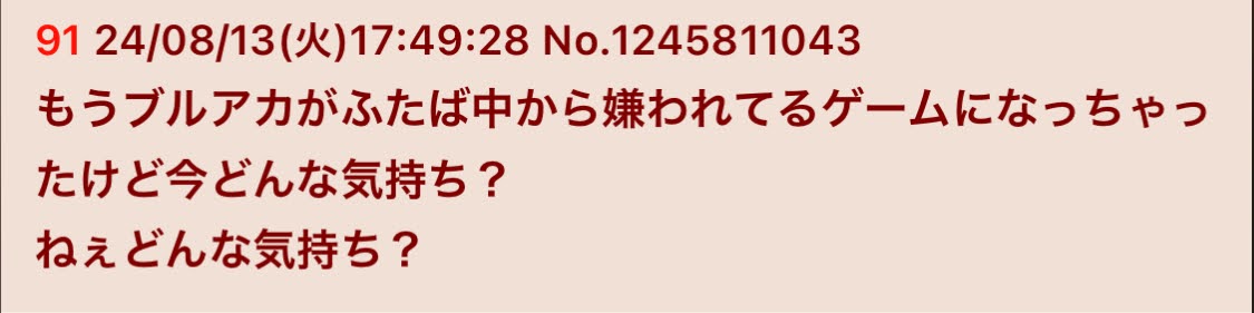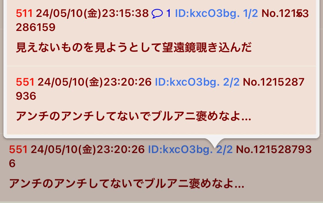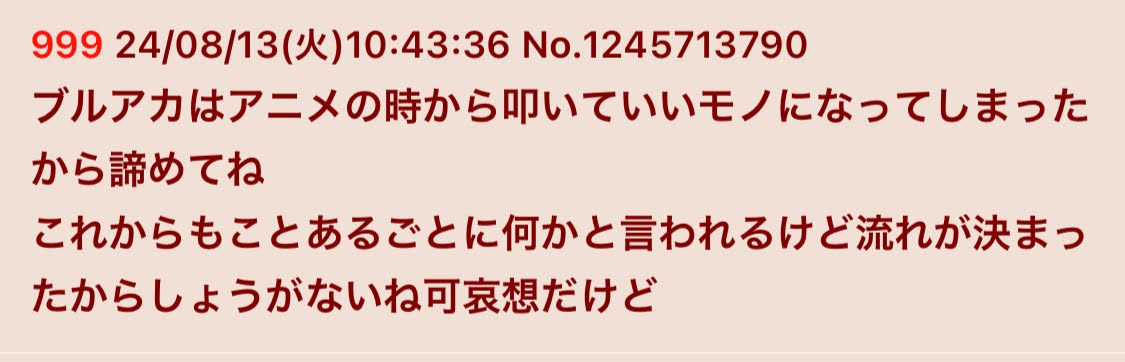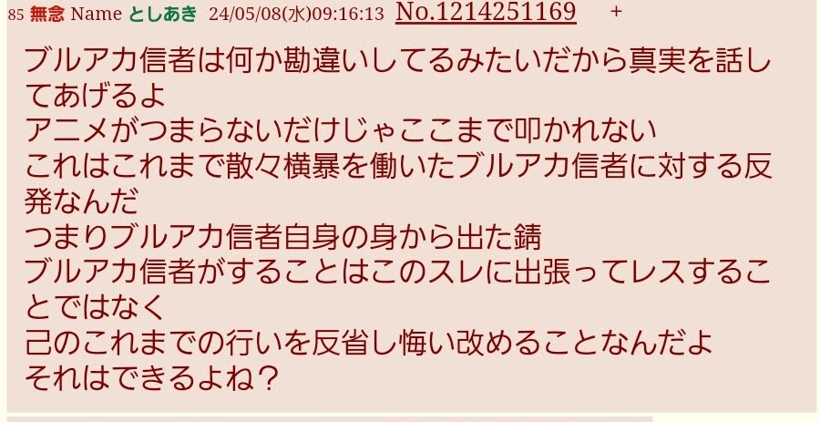 | … | 43無念Nameとしあき26/03/24(火)11:22:59No.1395999455そうだねx2>そもそもブルアカ本スレでアニメの話してたらスクリプトで荒らしてきた |