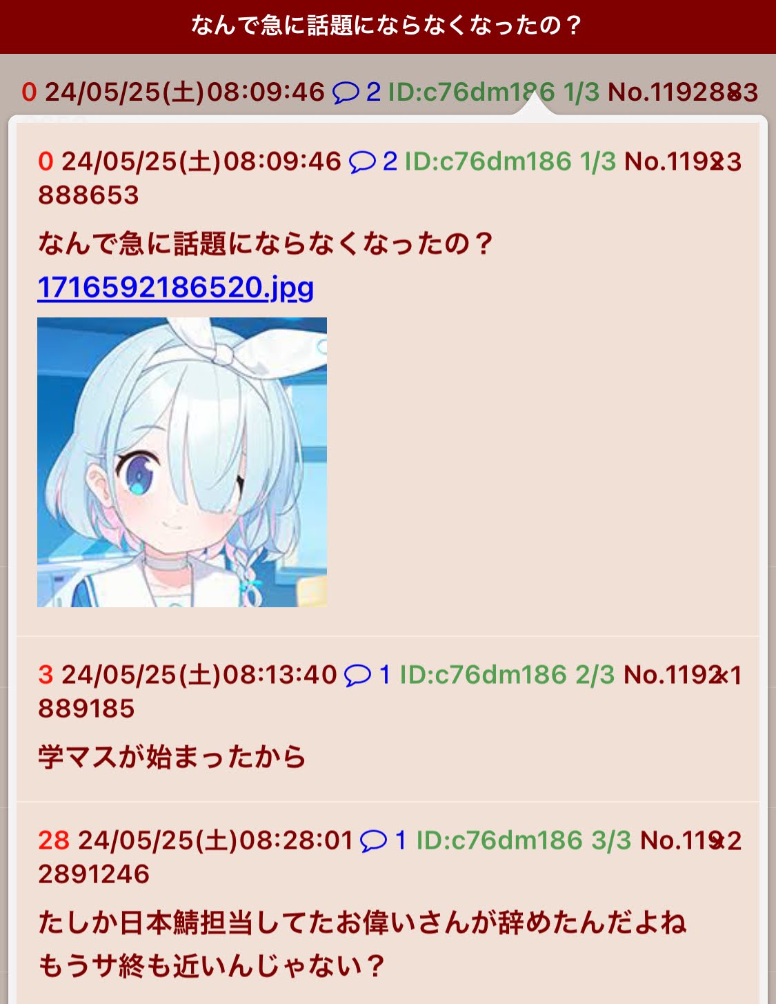 | … | 234無念Nameとしあき26/03/24(火)12:36:53No.1396010193+糖質の巣のブルアニスレが伸びてる時点で今のmayの住人がどんなのが多いかよくわかる |