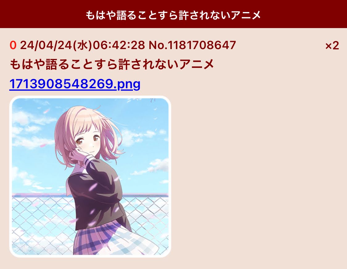| … | 272無念Nameとしあき26/03/24(火)13:02:37No.1396015186+最近は深夜アニメを掲示板で語りにくくなったから見る本数が減った |