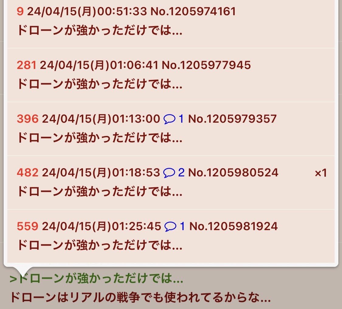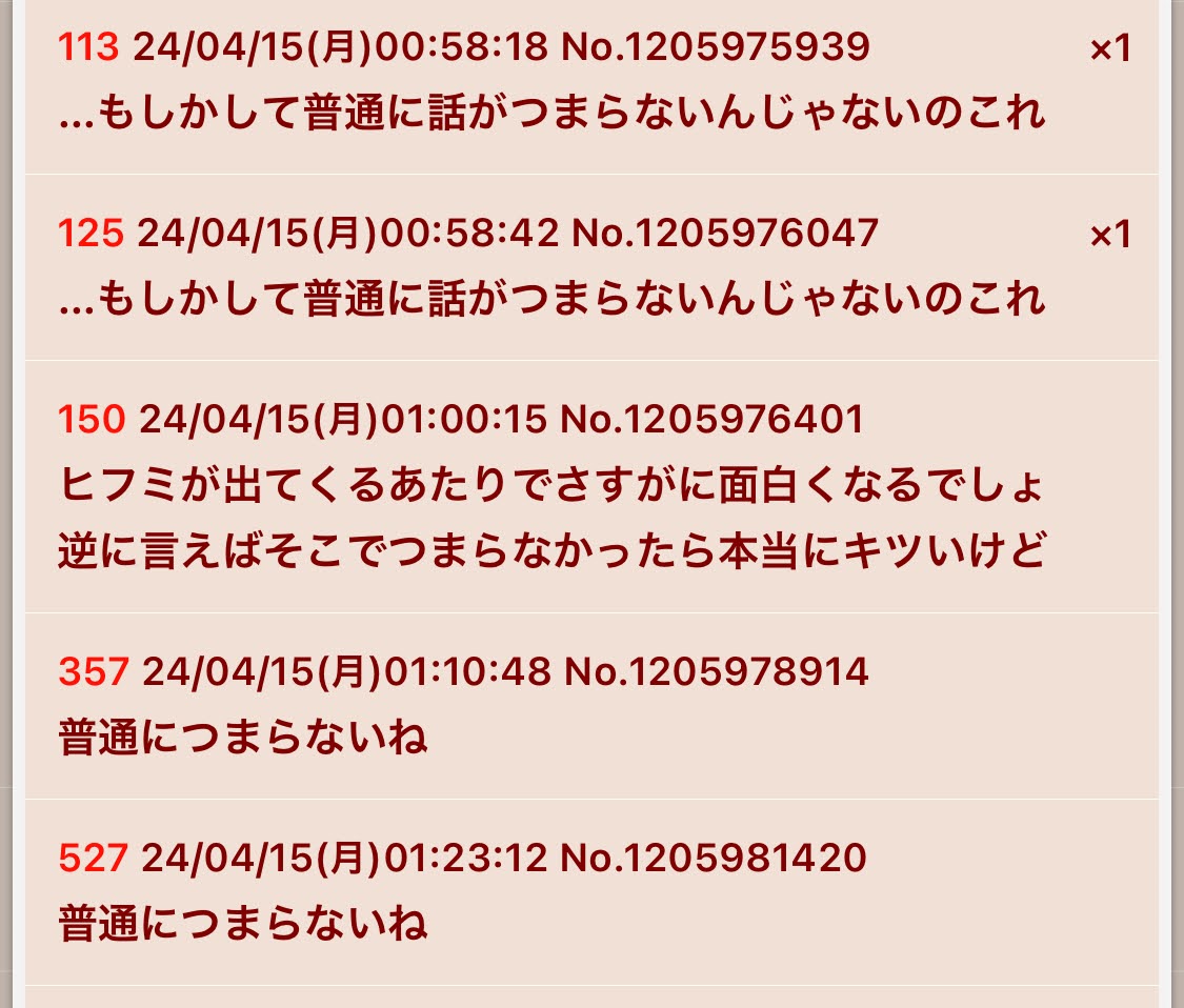 | … | 270無念Nameとしあき26/03/24(火)12:59:47No.1396014654+平日昼間でなくても伸びてるスレはだいたい荒れてるかコピペの類だよ |